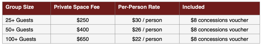 Standard VIP- $30 per person (Includes an $8 concessions voucher)